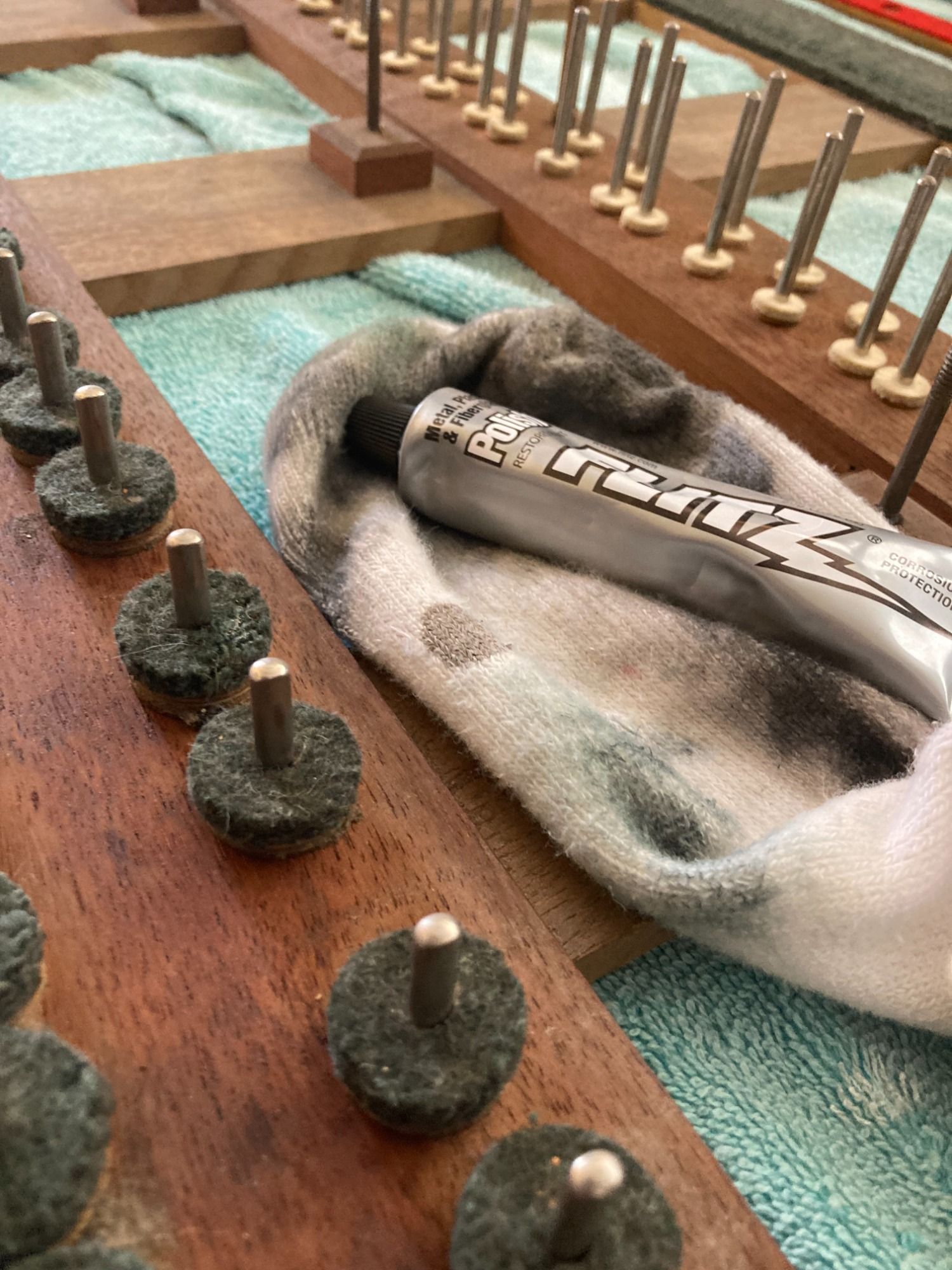 - Clean, polish, and lubricate the key frame, which entails removing the action and all 88 keys, hand polishing all 176 key pins (a front rail and balance rail pin for each key), and lubricating all of the moving action parts.